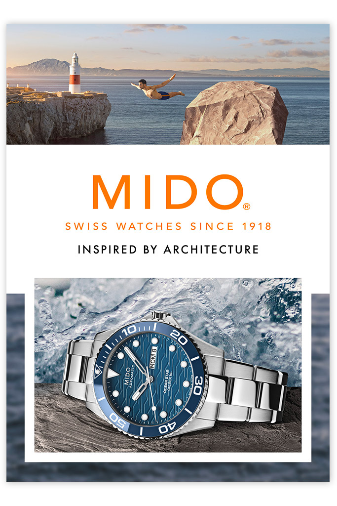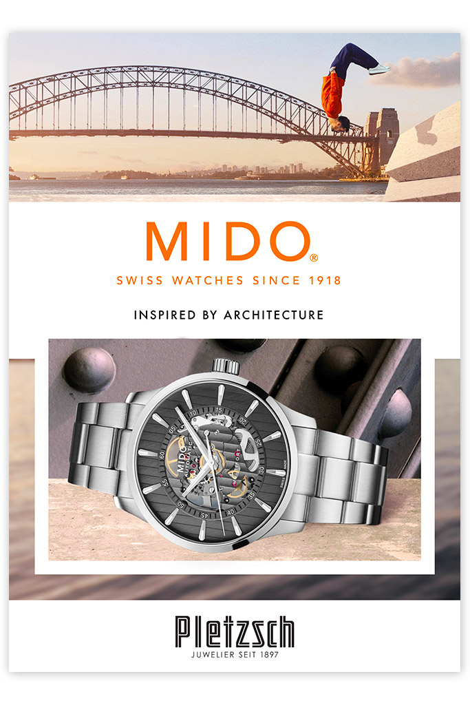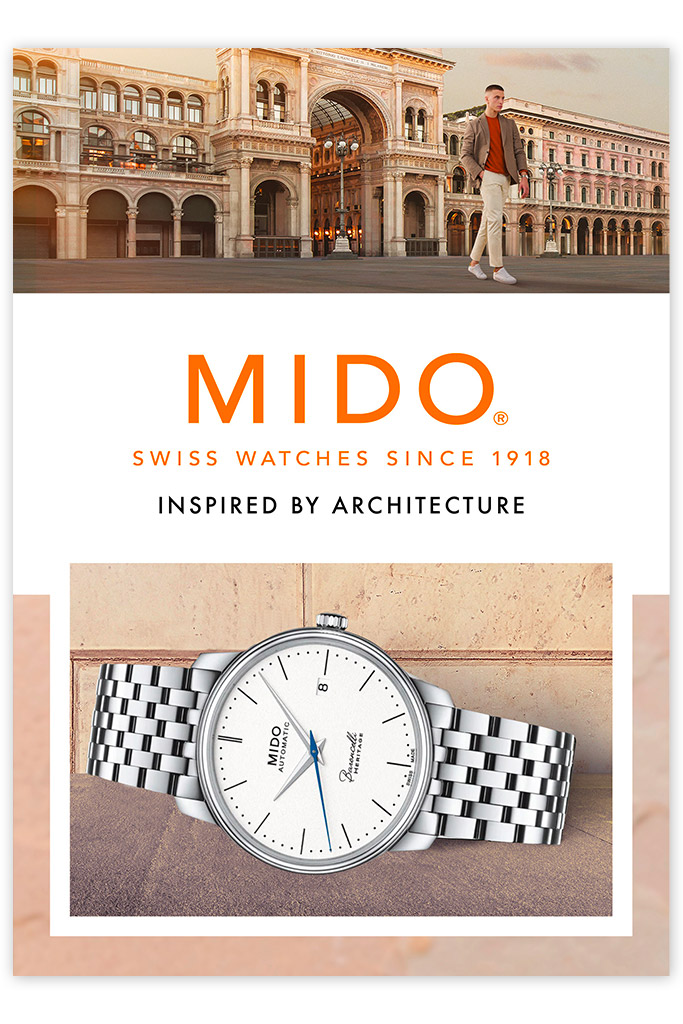 Visuels et déclinaisons digital & print de la campagne de communication de Mido, horlogier suisse alliant savoir faire avec une vision portée sur l’architecture et le sport.